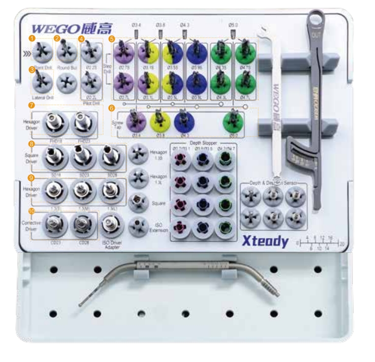 本套器械為Xteady牙種植體系統(tǒng)專用外科種植手術(shù)器械,采用顏色標(biāo)記的設(shè)計(jì),讓手術(shù)流程一目了然;整套器械由瑞士專業(yè)牙科工具供應(yīng)商制造,加工精良,設(shè)計(jì)合理,精確耐用;滅菌盒可反復(fù)高溫壓力滅菌,便于清洗,內(nèi)置配件盒,方便器械滅菌與使用。
